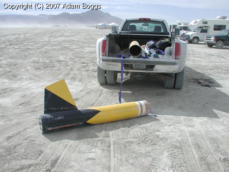 - A large copper rocket called "More Bad Wiring" from a Utah group. I don't know whether it was the wiring or something else, but it didn't make it down alive either.