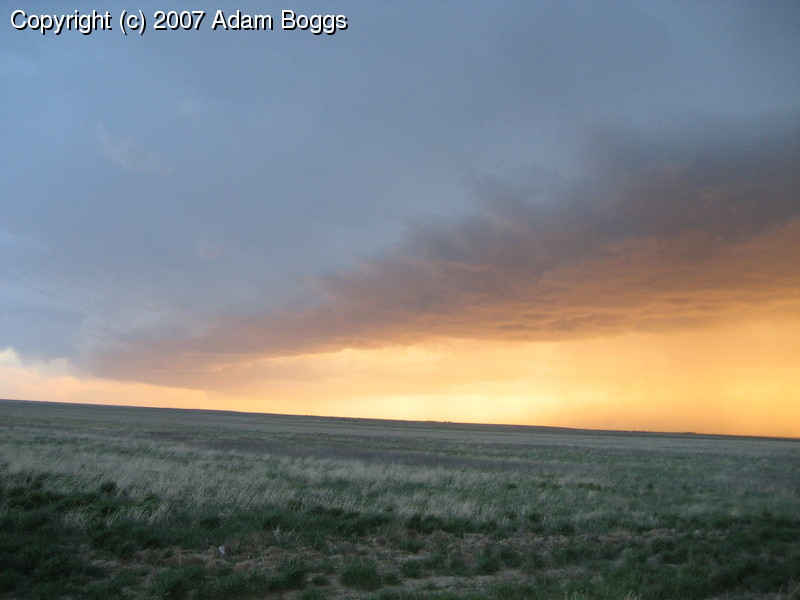 I headed up to northern colorado with Paul Robinson. We focused our chase near Ault, CO, HWY 85 north of there, and HWY 14 east of there. The storms fired quickly and lined out, but created some great spinups on the gust front. We even experienced a weaker circulation first hand as it plowed over us, blowing first hard from the left, then a calm "eye" for a few seconds, and then hard from the right before passing. While getting mildly sandblasted, it was certainly worth the experience! See the video for a clearer idea what we went through. (Listen to the the wind howl!) The circulation is harder to see in the photos. We were treated to an amazing sunset as the sun went down behind the approaching squall line.